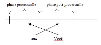 b) l’aspect de phase : la sélection de l’une des cinq phases d’un procès (pré-processuelle : « se disposer à Vinf » ; initiale : « se mettre à Vinf » ; médiane : « persister à Vinf », finale : « terminer de Vinf » ; post-processuelle : « rentrer de Vinf ») ;